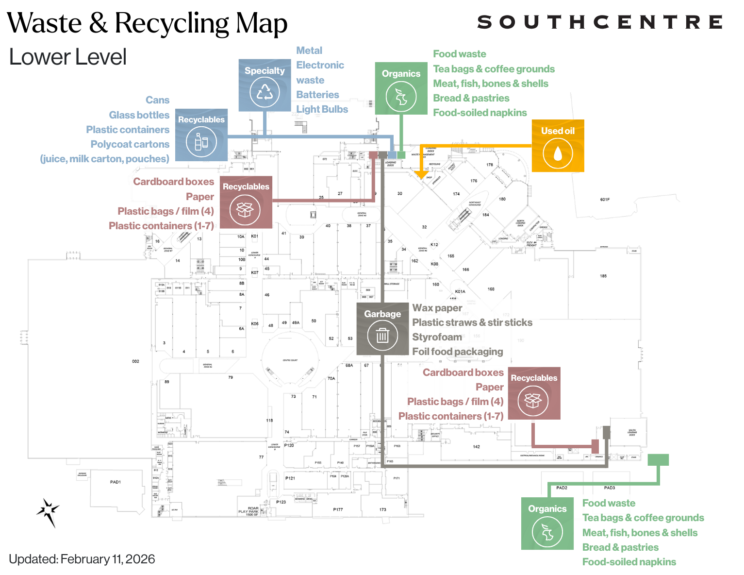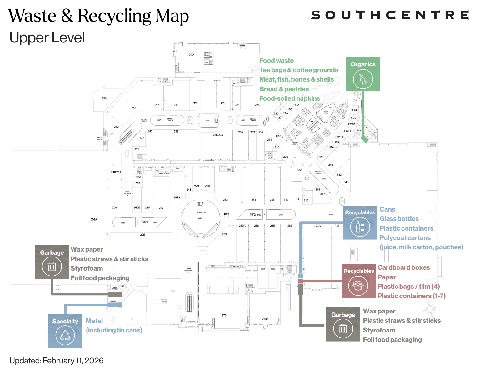 The purpose of this policy is to work collaboratively with Southcentre tenants to ensure our waste and recycling programs are sustainable, cost effective and adhered to by all tenants. This policy is effective as of January 2026.