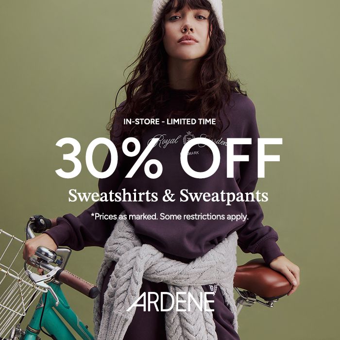 30% Off Sweatshirts & Sweatpants. In-Store, Limited Time. *Prices as marked. Some restrictions apply. #ardenelove