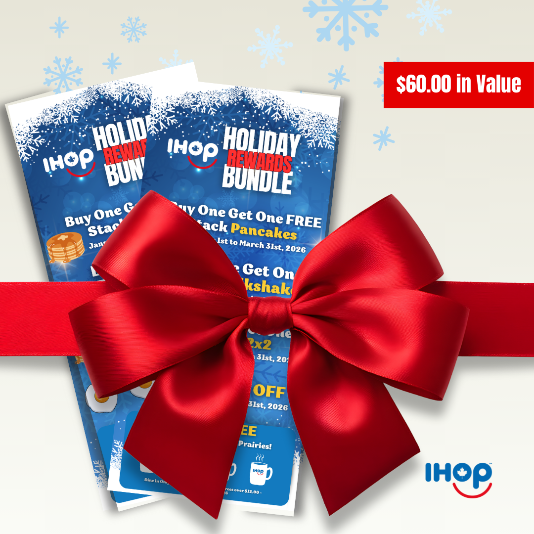 This season, share the sweetness with an IHOP Gift Card. Whether you’re treating a friend, family member, or grabbing one for yourself, our gift cards make every breakfast brighter. Buy a $25 IHOP Gift Card and receive a Bonus Card packed with up to $60 in added value. The perfect way to spread cheer and score extra savings! Visit us in restaurant to purchase your gift card today, available while supplies last until January 1st, 2026.